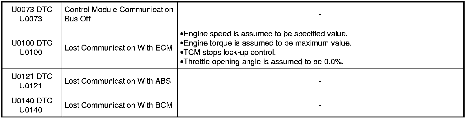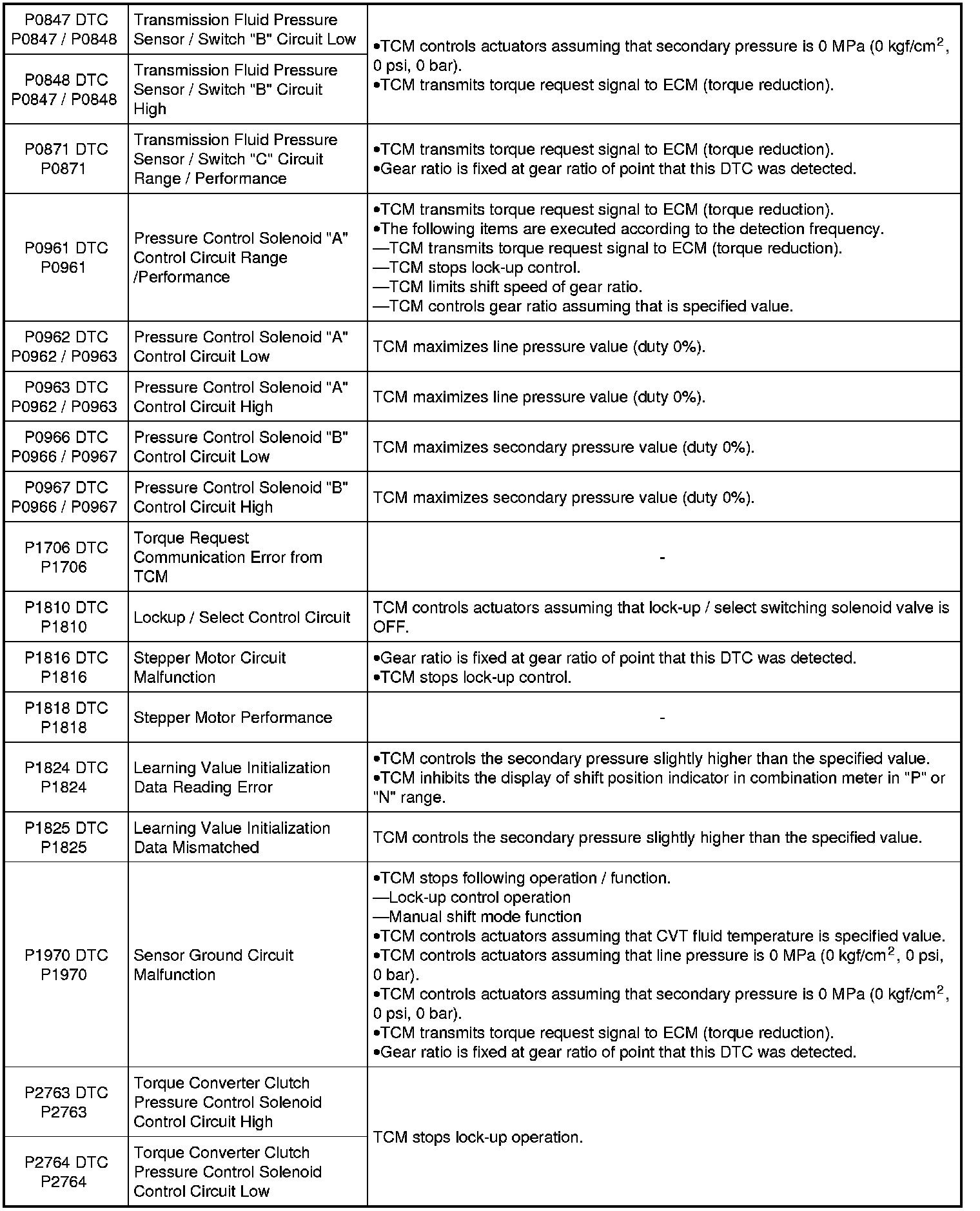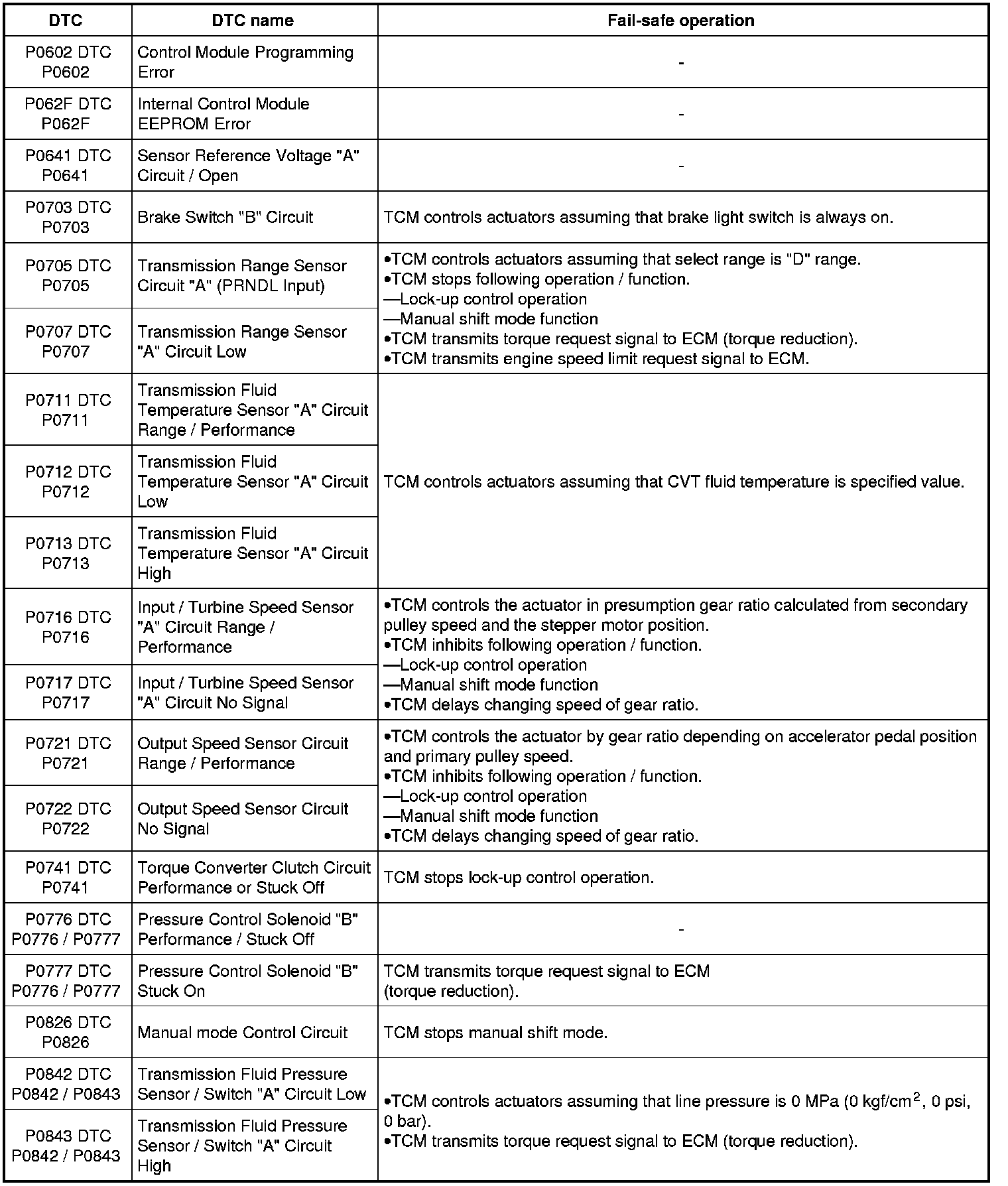 This function is provided by the safe mechanism that assures safe driveability even when the solenoid valve, sensor or its circuit fails. The following table shows the fail-safe function for each fail condition of sensor, solenoid valve or its circuit.