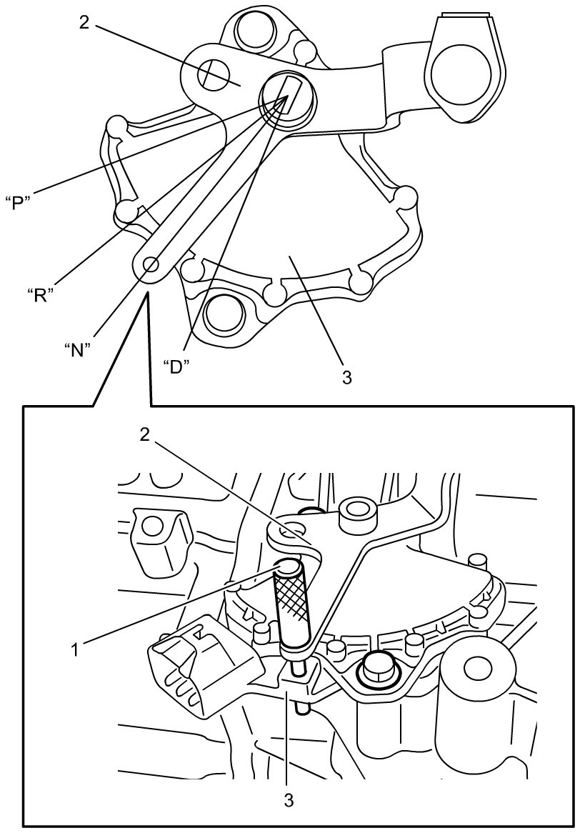Insert pin remover (4 mm) (1) to aligning hole on manual select lever (2) and check that the position of aligning hole on transmission range sensor (3) as shown in figure.