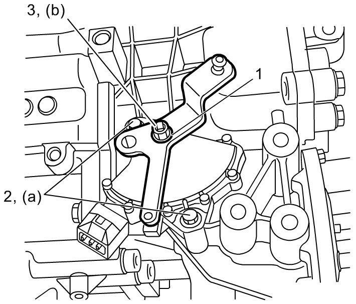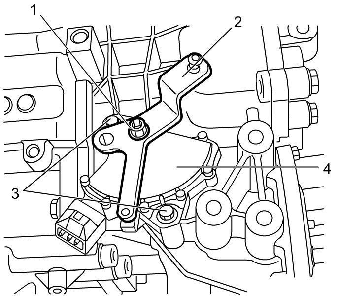 - Tighten transmission range sensor bolts (2) and new manual select lever nut (3) to specified torque.
