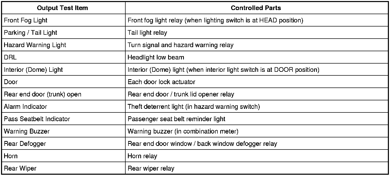 SUZUKI scan tool has the output test function which can force operation of following actuators and relays of the system controlled by BCM. When a malfunction is found in the system controlled by BCM, execute the output test which enables easy judgment whether the malfunction is on the input side or output side of BCM. For detailed information on operation of SUZUKI scan tool, refer to "SUZUKI Scan Tool Operator's Manual".
