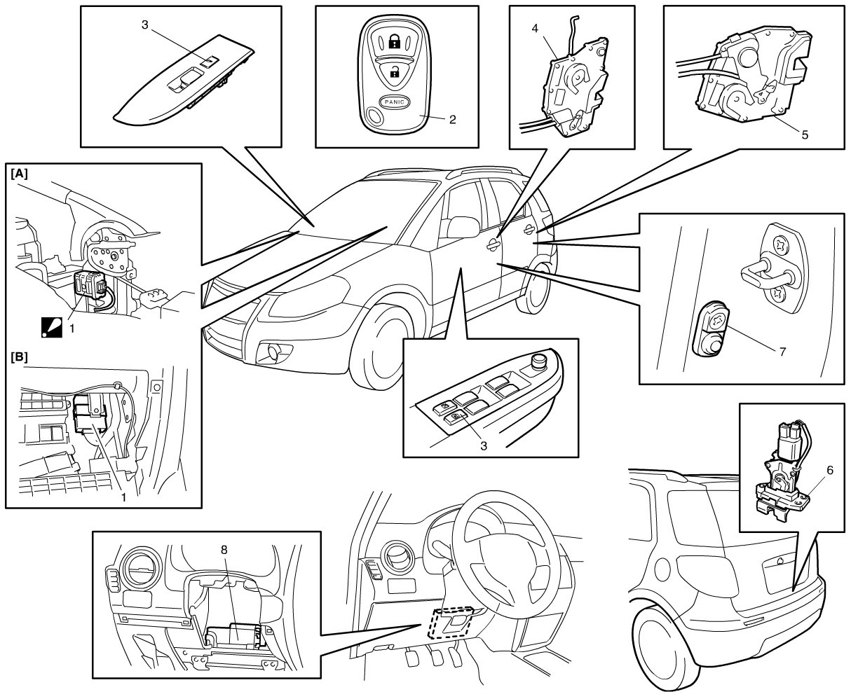 Power Door Lock and Keyless Entry System Component Location (If Equipped)