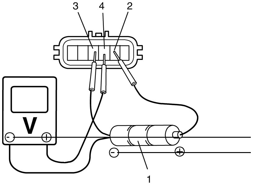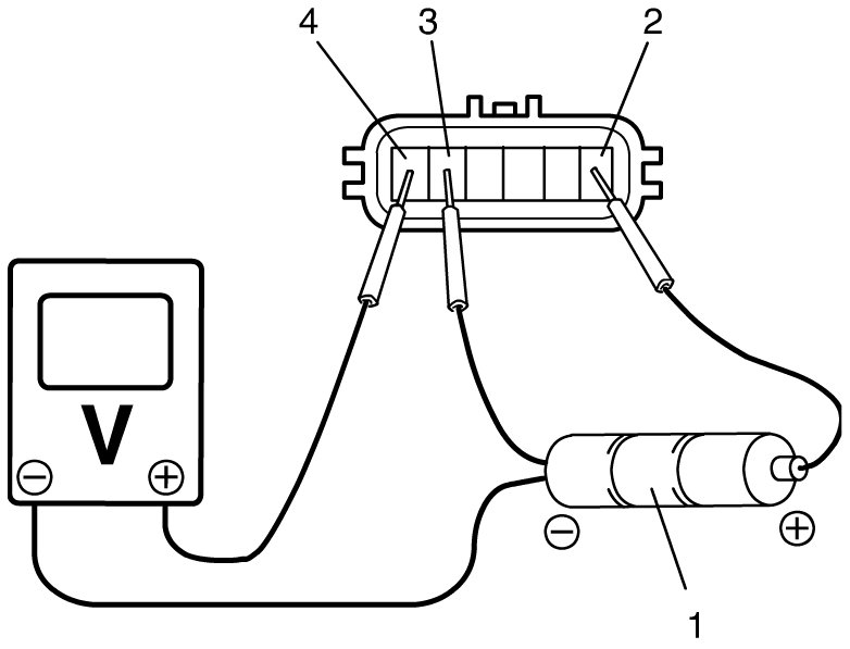 1) For APP sensor (main), arrange 3 new 1.5 V batteries (1) in series (check that total voltage is 4.5 - 5.0 V) and connect its positive terminal to "Vin 1" terminal (2) and negative terminal to "Ground 1" terminal (3) of sensor. Then using voltmeter, connect positive terminal to "Vout 1" terminal (4) of sensor and negative terminal to battery.
