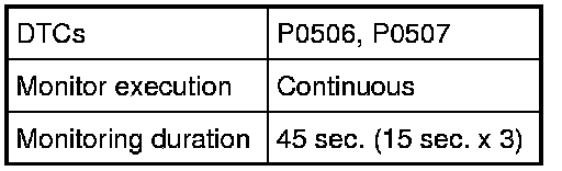 The Idle Air Control (IAC) is functionally checked throttle valve opening by monitoring the closed loop idle speed comparing with the desired idle rpm. If the idle rpm is higher than the desired idle rpm by 200 rpm or lower than the desired idle rpm by 100 rpm, an IAC malfunction is detected. (P0507, P0506)