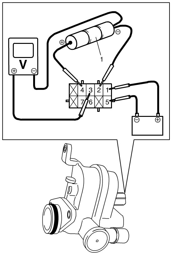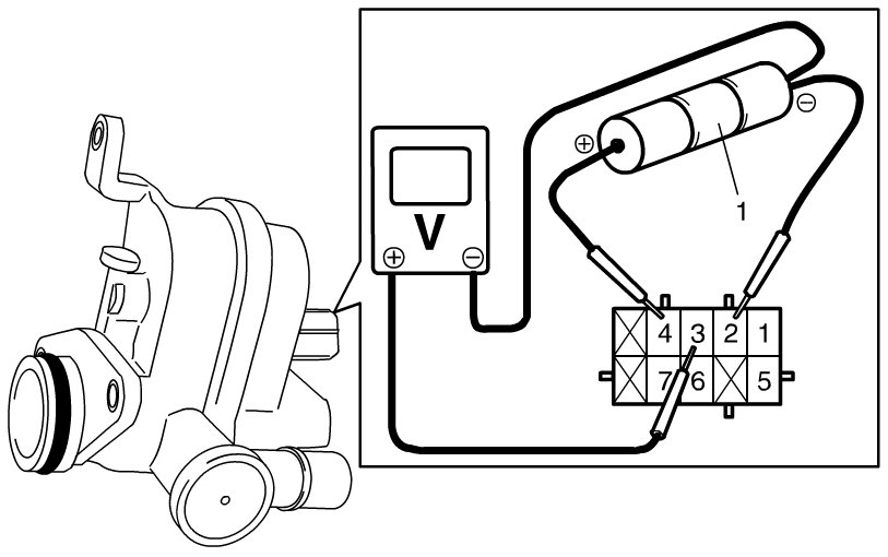 a) In the state of Step 1), operate EVAP leak detection pump by connecting 12 V-battery to terminal "1" and terminal "5" of EVAP leak check module. Under pump operating, check that pressure sensor output voltage (reference orifice vacuum) becomes lower than pressure sensor output voltage of Step 1) by approx. 0.1 V.