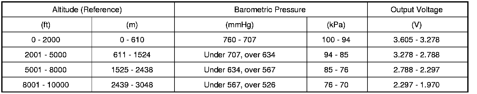 EVAP leak check pressure sensor output voltage for initial (barometric) pressure (Terminal "4" voltage 4.5 - 5.5 V, ambient temp. 20 - 30 °C (68 - 86 °F))