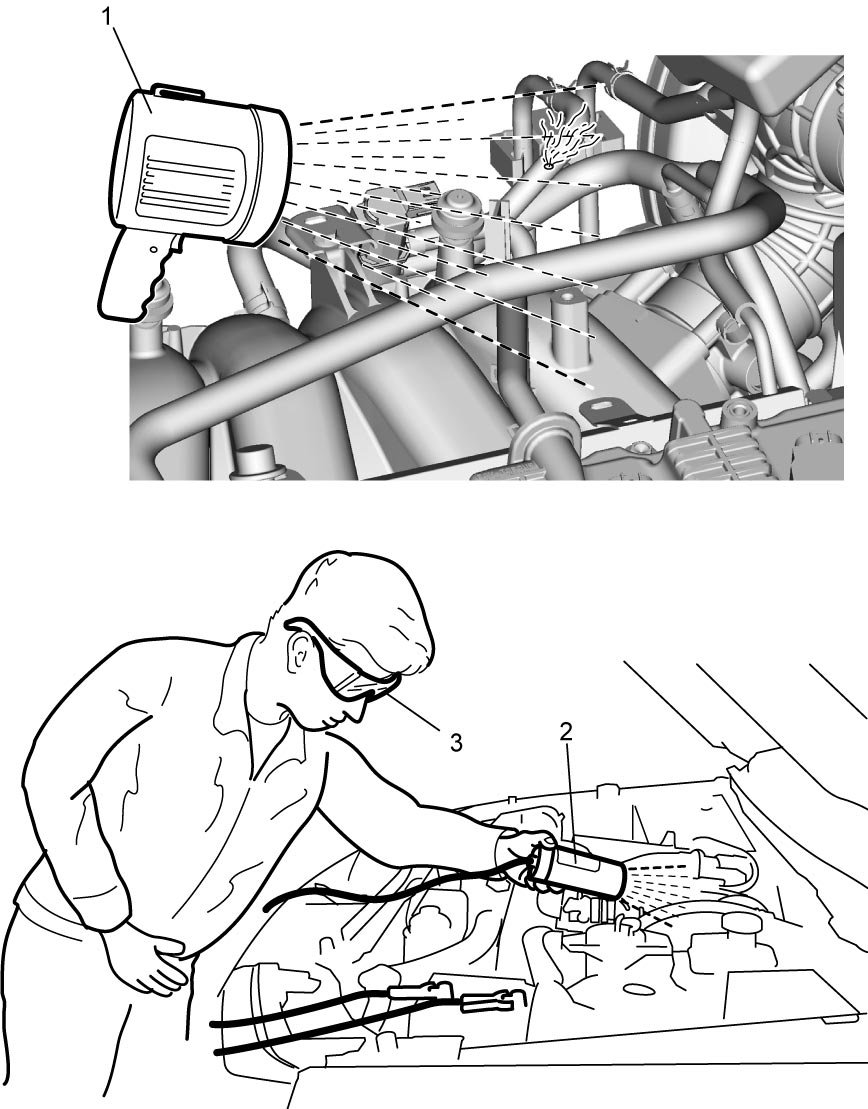 Using the ultraviolet light (2) and shield glasses (3) if available, the exact location of the leak can be identified. The Ultra Trace UVTM, which has been deposited at the exact location of the leak, fluoresces by shinning the ultraviolet light. Once the area of the leak is identified by the exiting smoke, this method is helpful when the leak is in an area that is not readily visible.