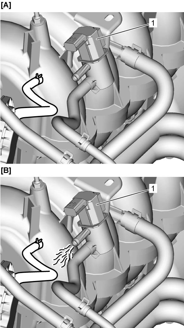 21) Check EVAP canister purge valve (1) for any leak when valve is switched ON and OFF by using SUZUKI scan tool or service wire. If check result is not described below, replace EVAP canister purge valve.