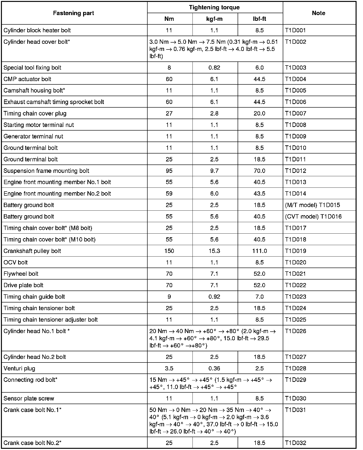 Tightening Torque Specifications