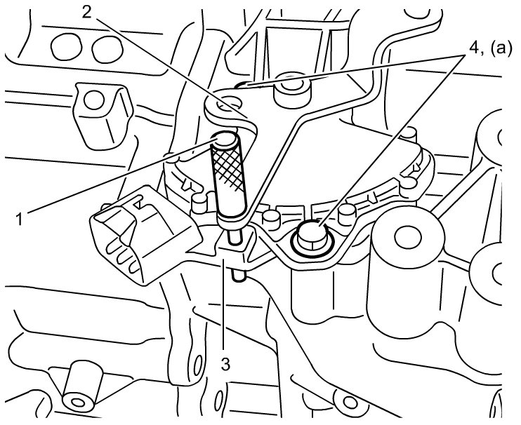 5) Insert pin remover (4 mm) (1) to aligning hole on manual select lever (2) and check that the position of aligning hole on transmission range sensor (3) as shown in figure. If not, loosen transmission range sensor bolts (4) and align them.
