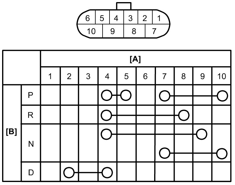 If faulty condition cannot be corrected by adjustment, disconnect transmission range sensor connector and check that continuity exists as shown by moving manual select lever.