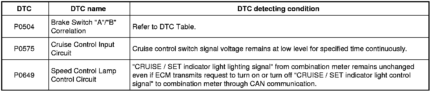During engine running, DTC is detected by pushing cruise control switch (MAIN (ON/OFF), CANCEL, RES/ACC, or SET/COAST) for more than specified time.