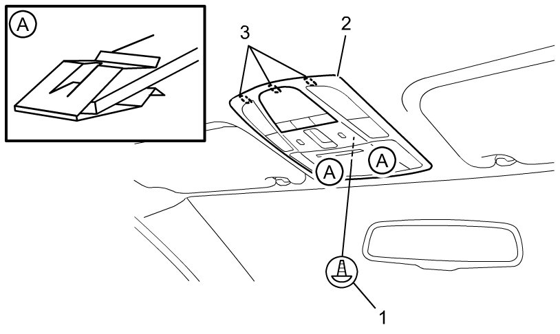 3) Release claws (3) from roof lining and remove overhead console box (2).