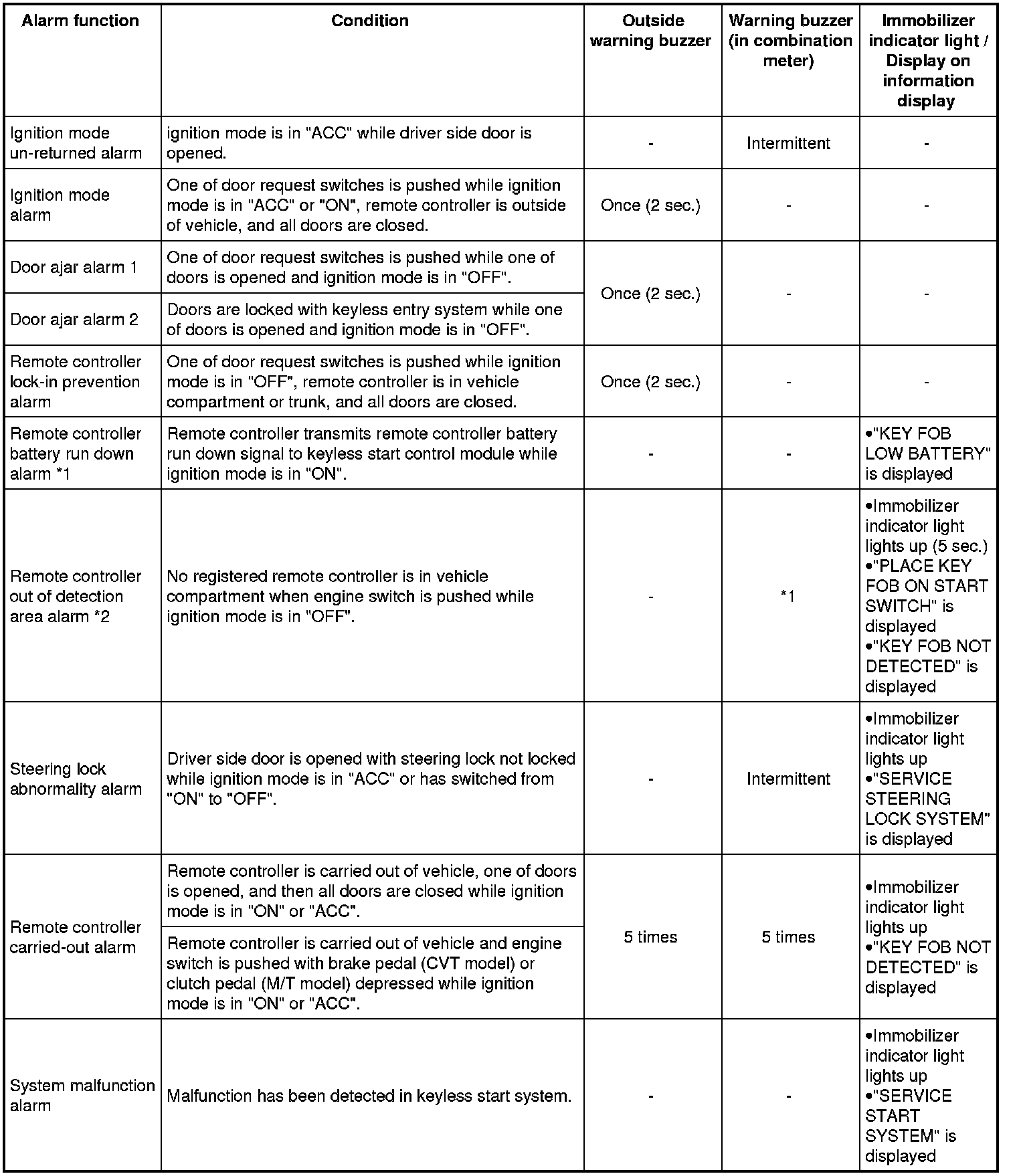 Description of Keyless Start System Alarm Function