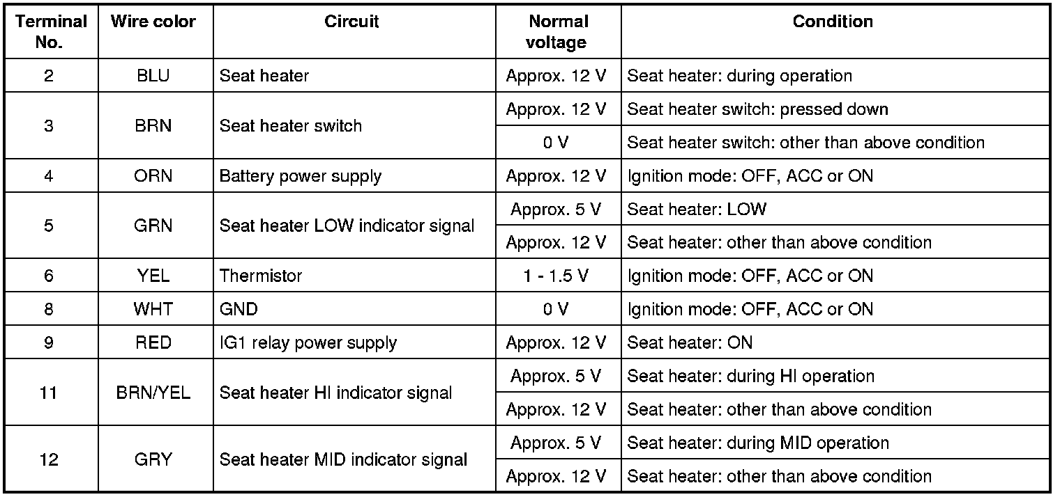 Never connect a voltmeter directly to any terminal on the seat heater control module by disconnecting the its connectors.