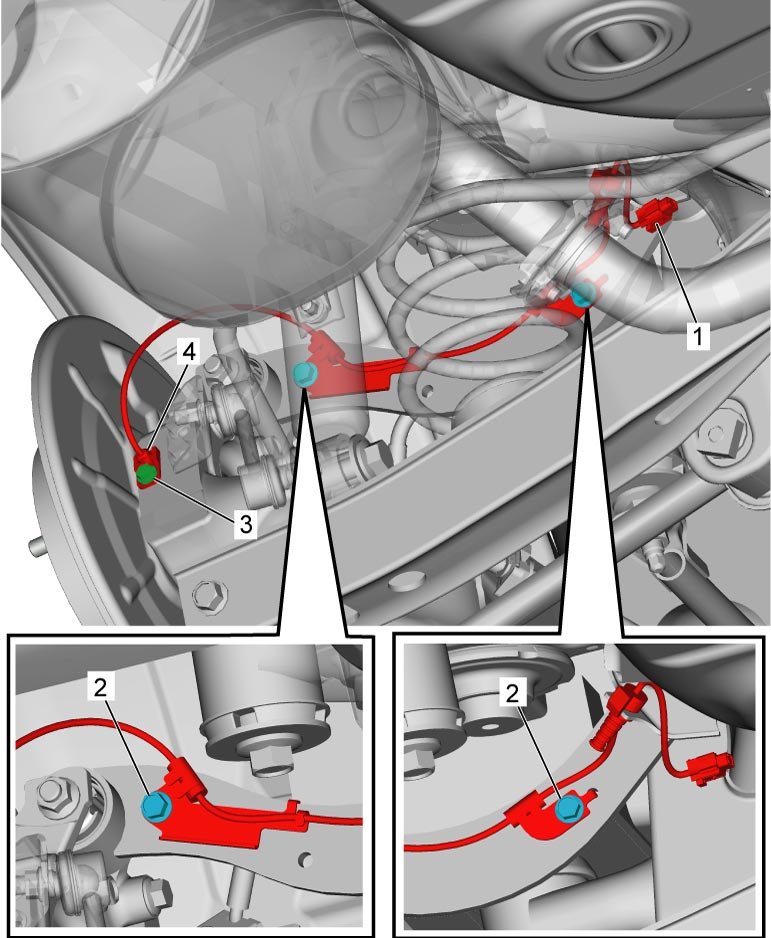 - Tighten rear wheel speed sensor bolt (1) and rear wheel speed sensor bracket bolt (2) to specified torque.