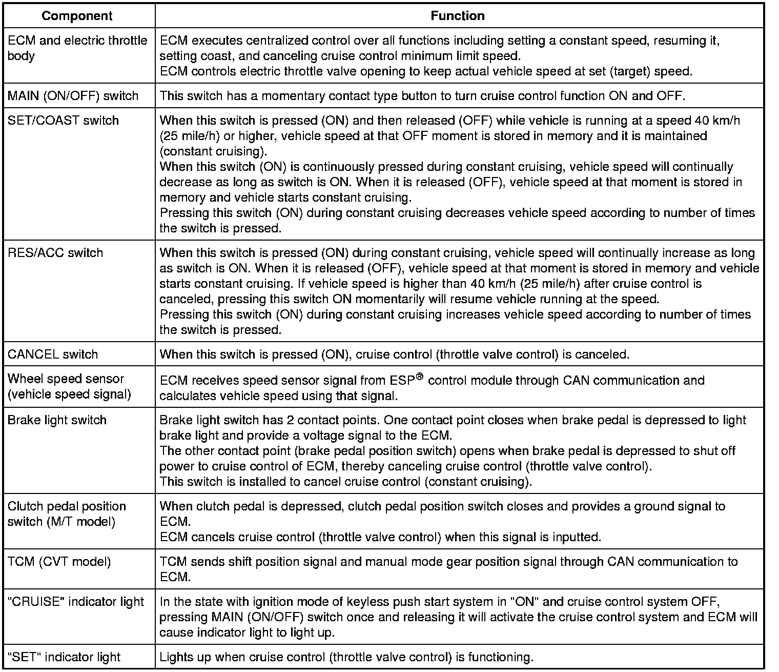 Description of Cruise Control System Components and Functions