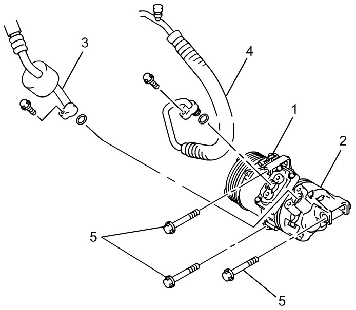 6) Disconnect suction hose (3) and discharge hose (4) from A/C compressor (2).