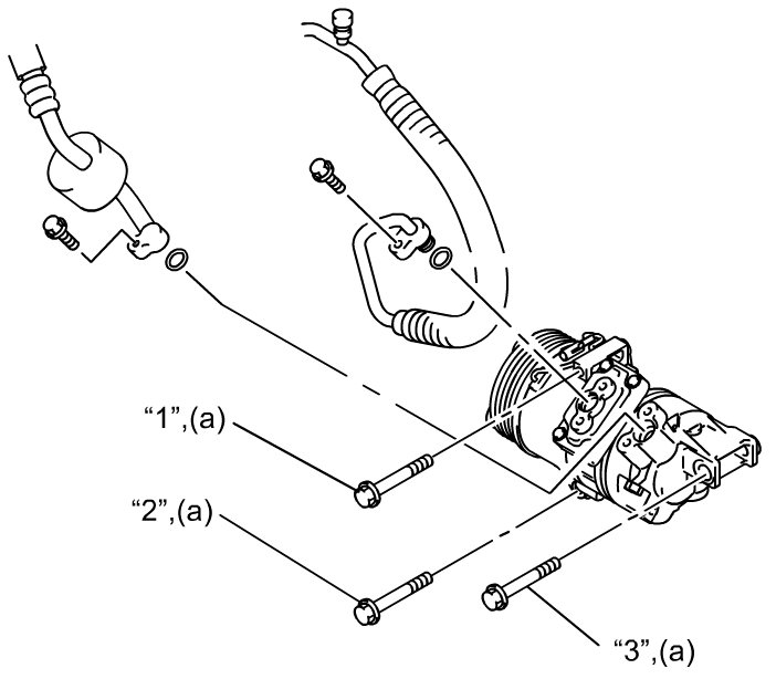 - Tighten A/C compressor mounting bolts in numerical order ("1" through "3") to specified torque as shown.