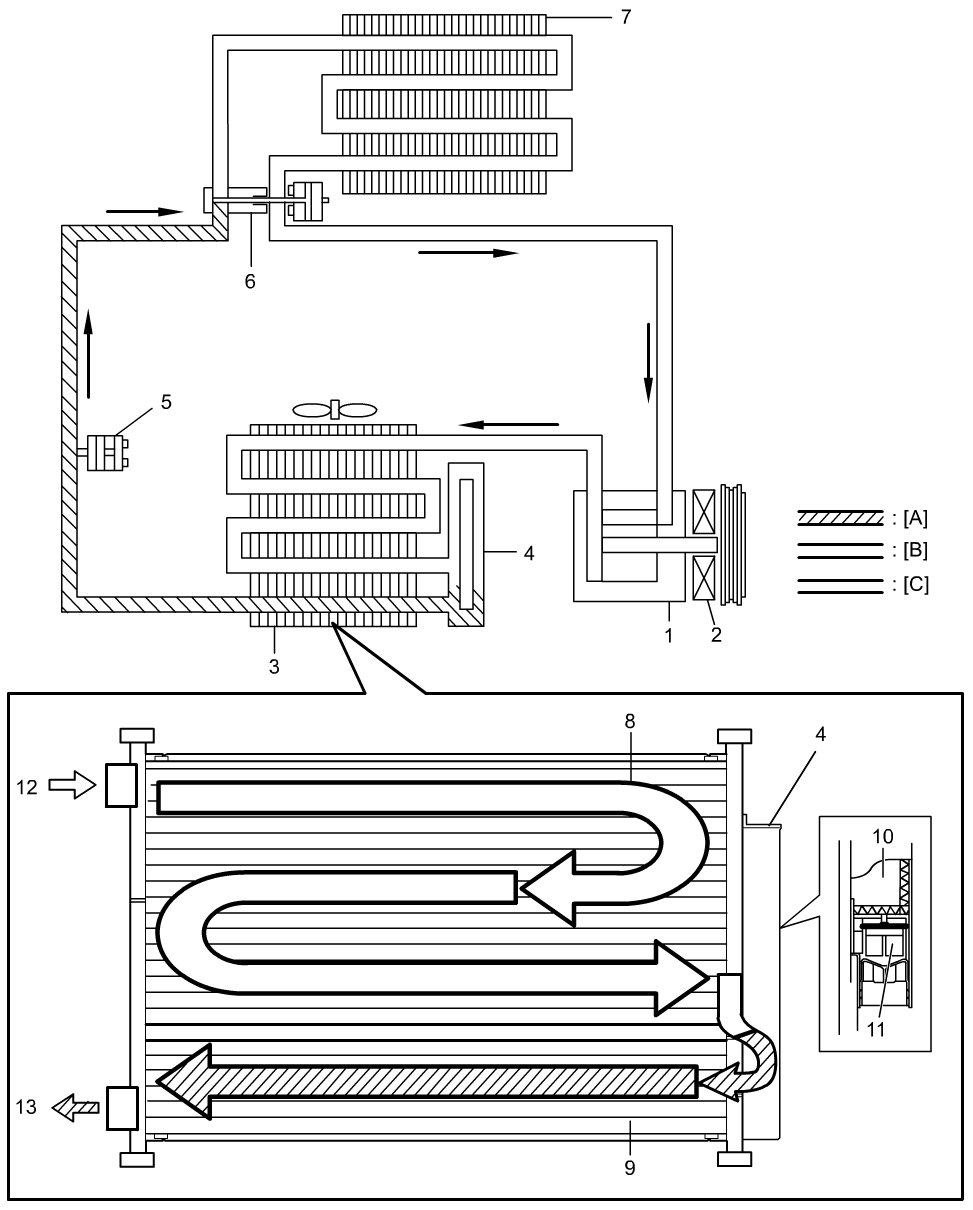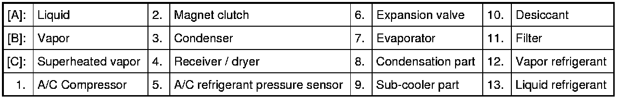 In the sub-cool A/C system (condenser integrated with receiver / dryer), the inside of the condenser is divided into the condensation part and the sub-cooler part, and the receiver / dryer is located between them. In the receiver / dryer, the refrigerant is separated into the vapor refrigerant and the liquid refrigerant. Only the liquid refrigerant is delivered to the sub-cooler part of the condenser. The refrigerant is supercooled by the sub-cooler part of the condenser.