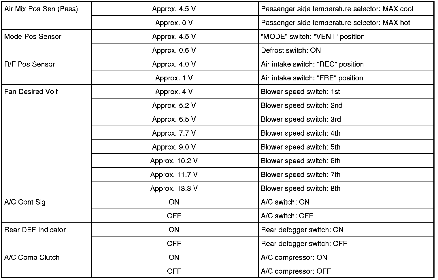AIR MIX POS SEN (PASS) (Passenger side temperature control actuator position sensor, V)