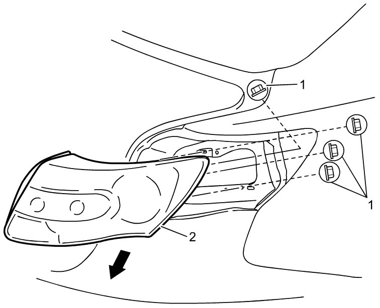 4) Remove rear combination light (2) by pushing it in the direction of arrow.