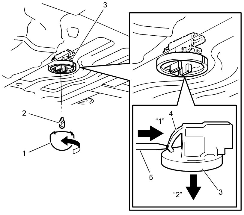 1) Remove trunk light lens (1) by turning it in direction of arrow and then remove bulb (2).