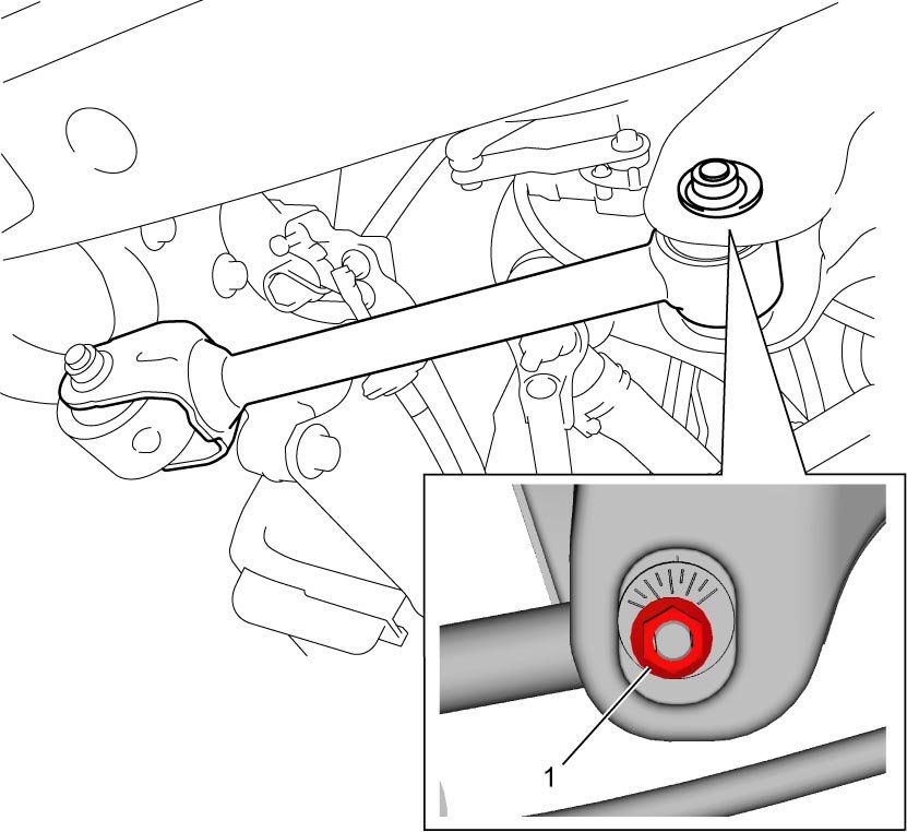 7) Turn lower arm adjustment bolts (1) at right and left by same amount to adjust toe and camber to values in specified ranges.