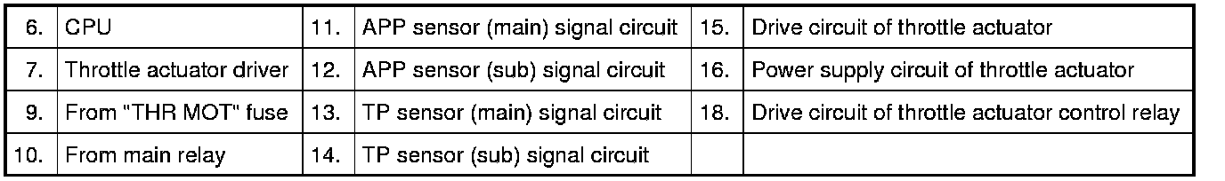 In this system, TP sensor and APP sensor have 2 sensors (main and sub) each to assure highly accurate and highly reliable control and abnormality detection. Also, when ECM detects an abnormality in the system, it turns off the throttle actuator control relay (8) to stop controlling the throttle actuator. When the throttle actuator control relay is turned off, the throttle valve is fixed at the opening of about 7° (default opening) from its completely closed position by the balance of the return spring and open spring in the throttle body.