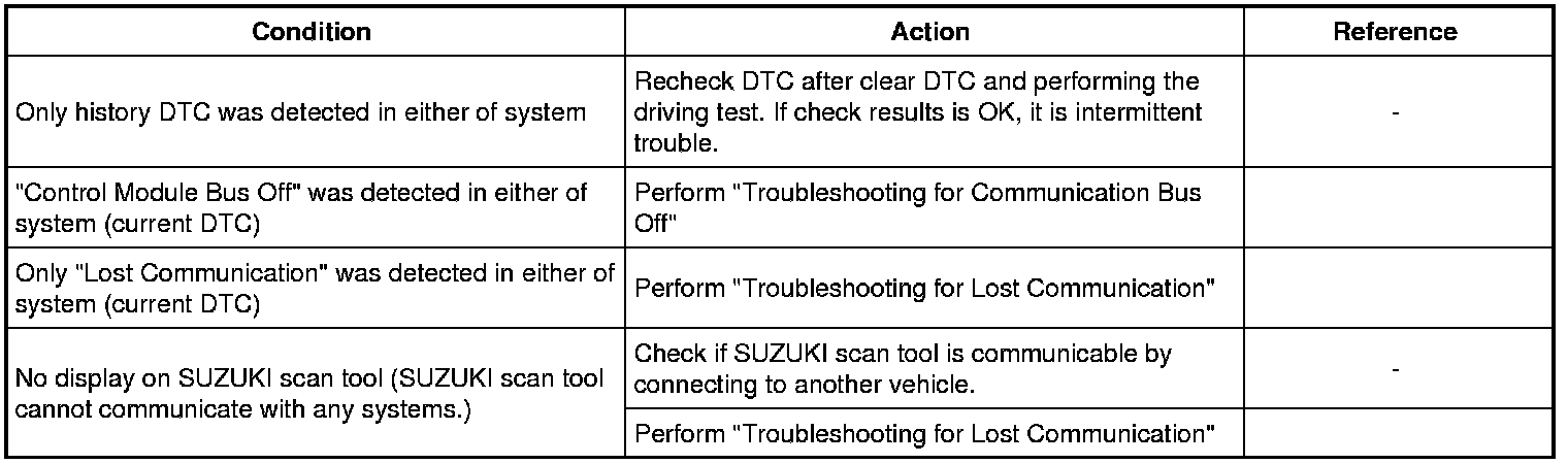 Using SUZUKI scan tool, execute "Communication Malfunction DTC" under "Bus check" and check DTCs of all control modules connected to CAN Communication Bus.