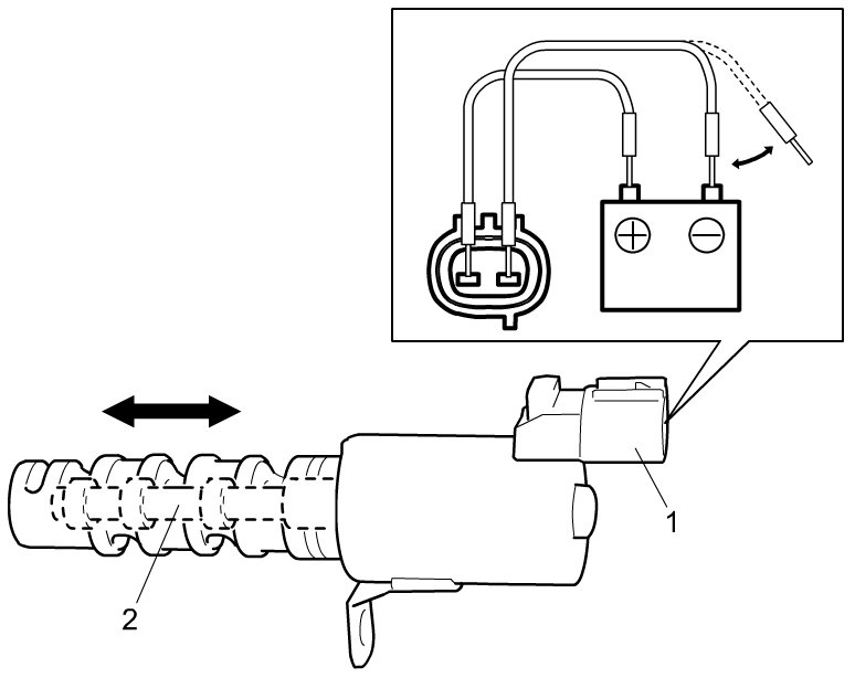 - Connect battery to OCV connector (1) as shown in figure, and check that there is operating sound and that spool valve (2) is properly operating.