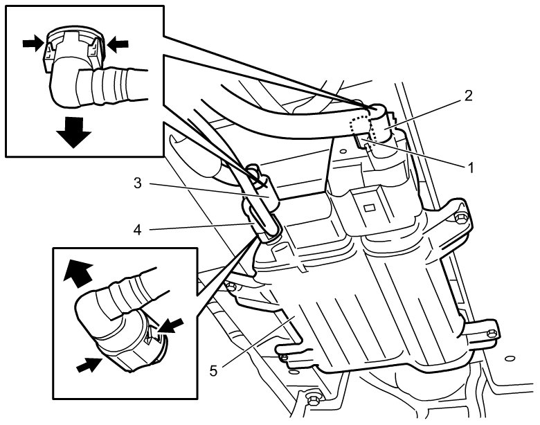 5) Disconnect suction pipe (2) from EVAP leak check module and disconnect filler pipe (3) and purge pipe (4) from EVAP canister as follows: