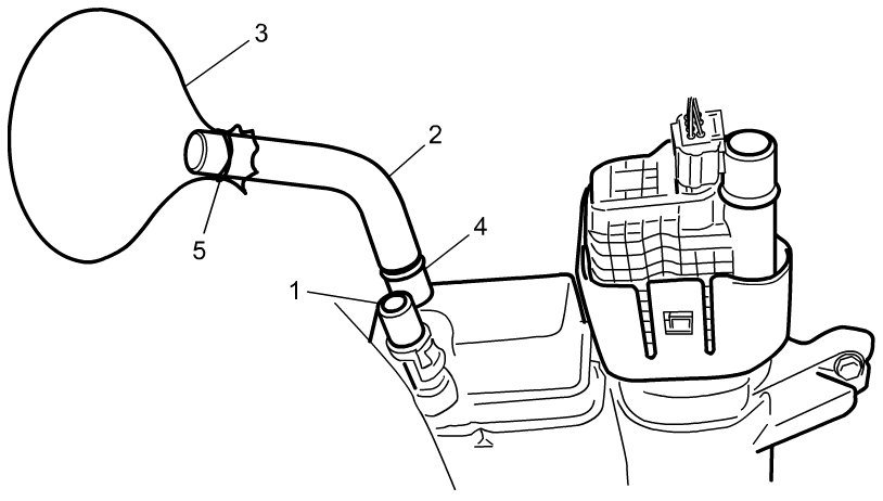 c) Connect vacuum hose (2) and spherical plastic bag (3) with approximately 12.5 cm (4.92 in.) diameter (volume: 1.0 liter (2.11/1.76 US/Imp pt)) to filler port (4) using a rubber band (5) as shown in figure.
