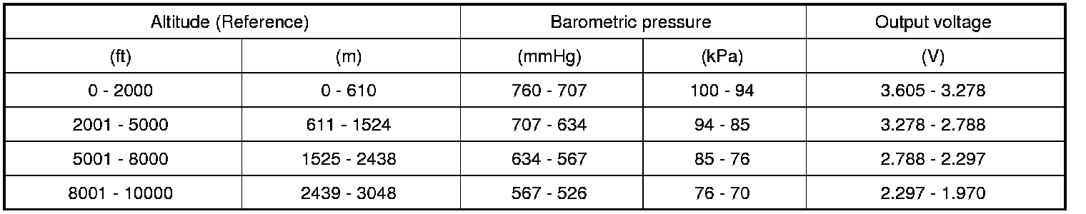 3) Check EVAP leak check pressure sensor output voltage (barometric pressure signal voltage) between "E01-8" terminal and ground, according to the following table.