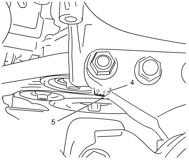 3) Insert socket wrench through service hole (2) of front fender lower lining (1). Turn crankshaft pulley (3) clockwise and align crankshaft pulley notch mark (5) with 0° (TDC) mark (4) of timing chain cover. Matchmarks of camshaft housing No.1 (6) and exhaust camshaft timing sprocket (7) have to be aligned to each other.