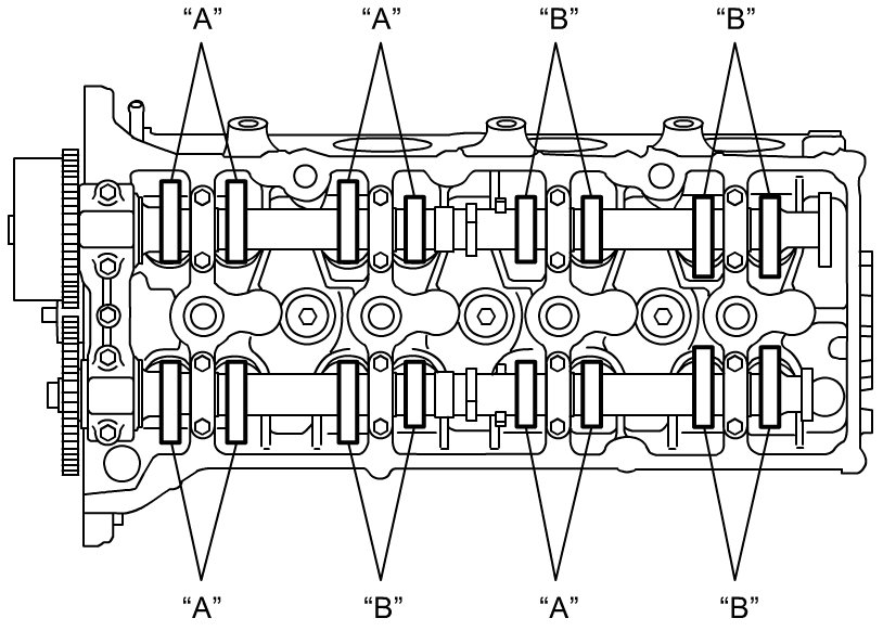 a) Measure valve clearances of "A" valves as indicated in the following figure.