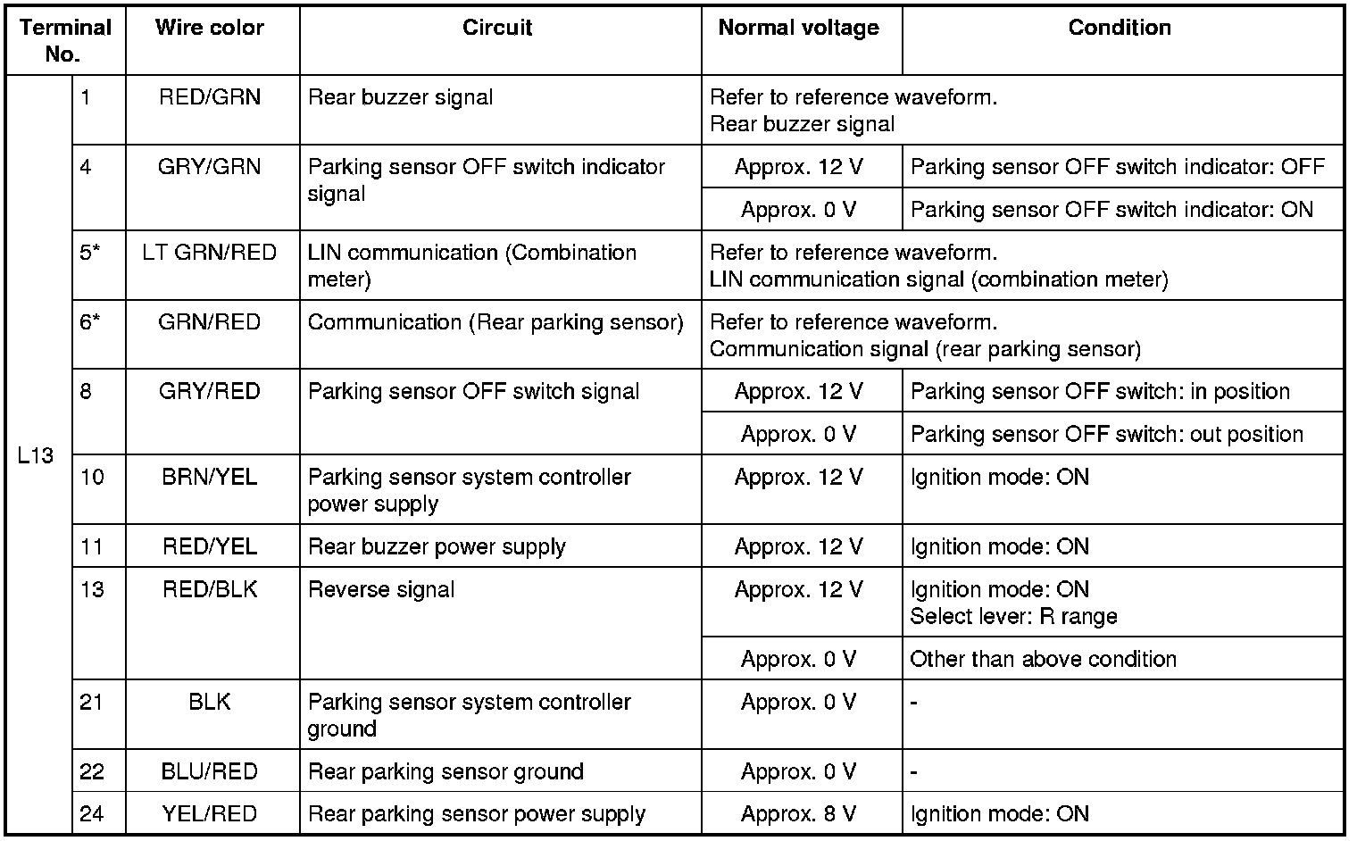 - Outputs from terminals marked with asterisk (*) cannot be measured with voltmeter because they are pulse signals. Use oscilloscope for measuring these outputs.