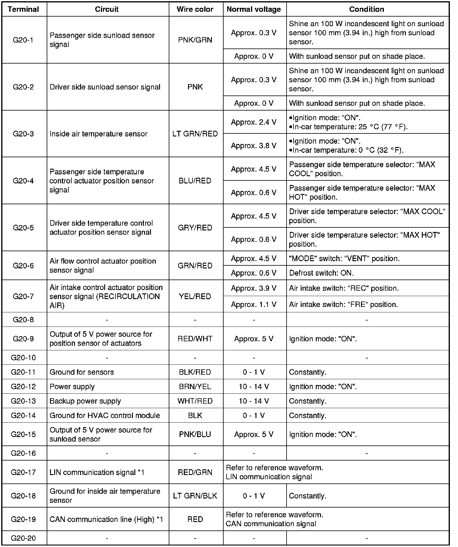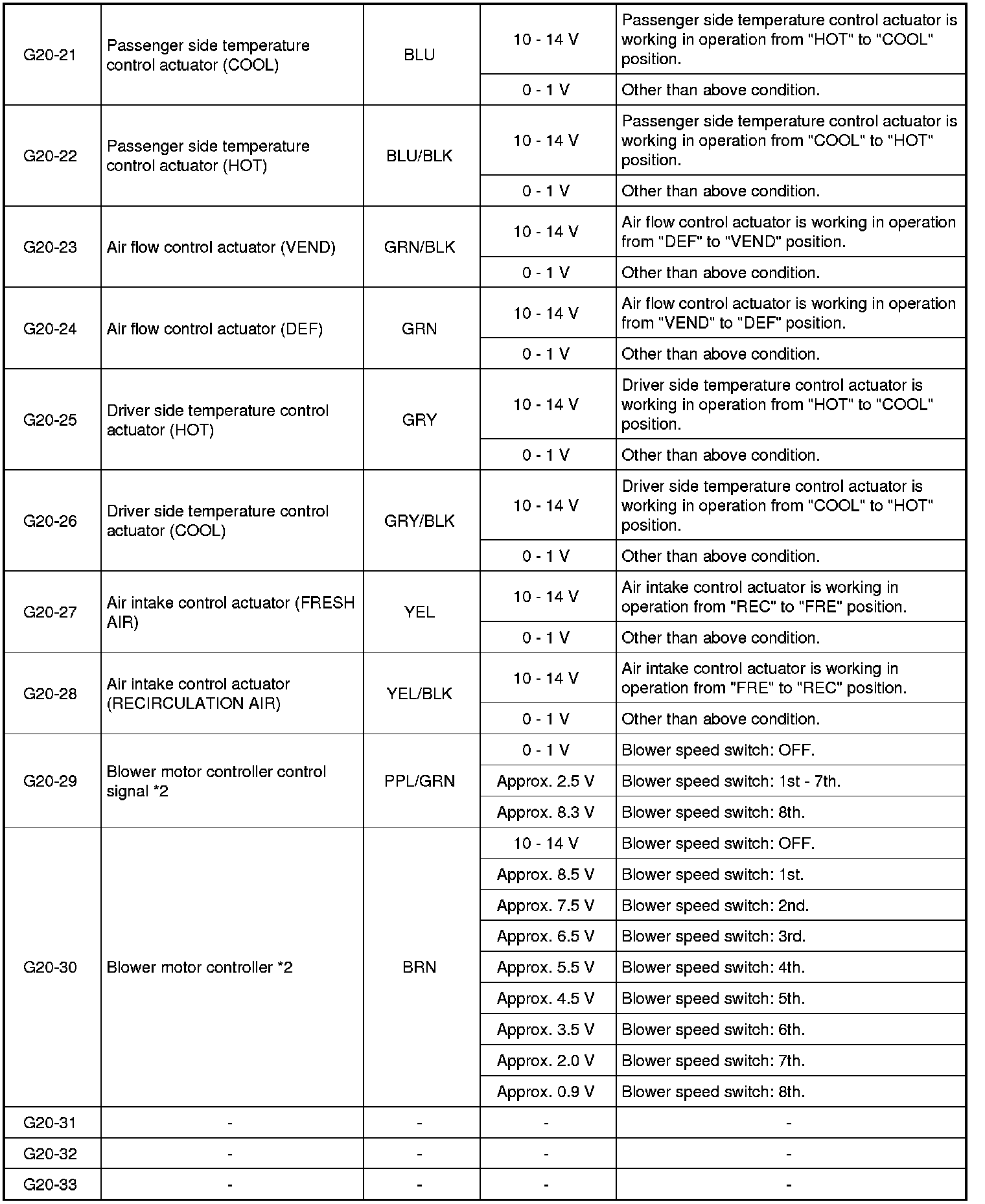 - Normal voltage of circuits with asterisk (*2) are reference values corresponding to when control puts the temperature control actuator at max cool position, air flow control actuator at "VENT" position, air intake control actuator at "REC" position and battery voltage is approx. 12 V.