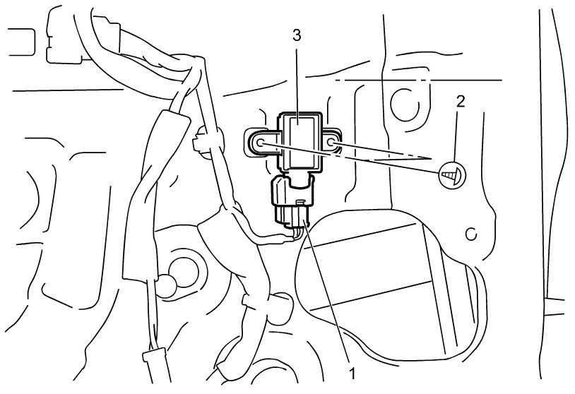 4) Remove front side impact sensor screw (2) and remove front side impact sensor (3) from front door.