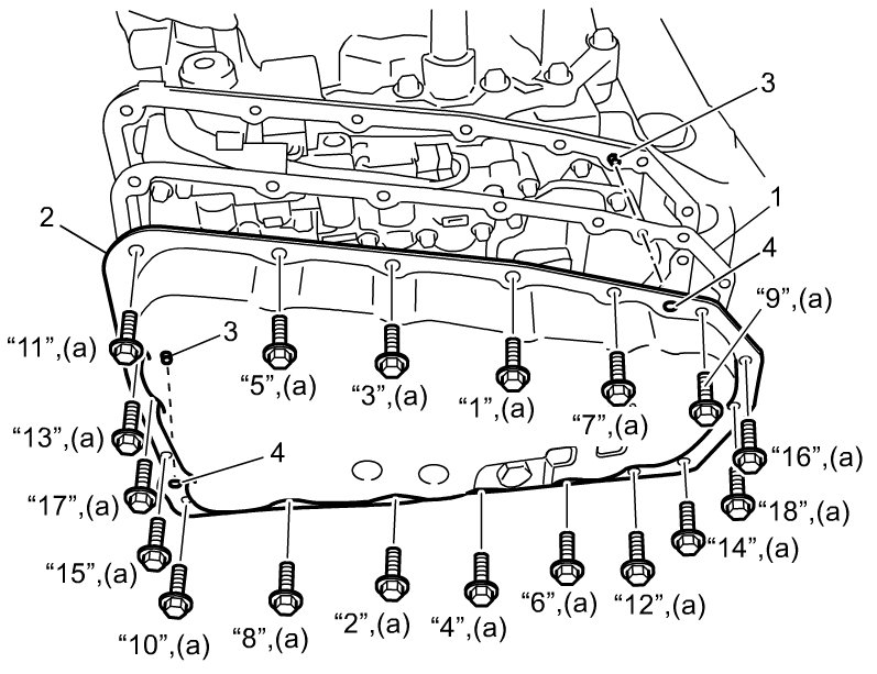 Tighten CVT oil pan bolts in numerical order ("1" - "18") evenly and gradually to specified torque.