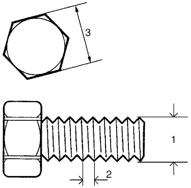 It is important to note that, even when the nominal diameter (1) of the threads is the same, JIS-defined and ISO-defined fasteners may be different in thread pitch (2) or width across flats (3). Refer to the JIS-to-ISO Main Fasteners Comparison Table below for these differences. Before installing a fastener, check it for correct thread pitch and then, screw it in or on the mating fastener by hand. If the fastener is too tight to turn by hand, its thread pitch may be different from that of the mating fastener.