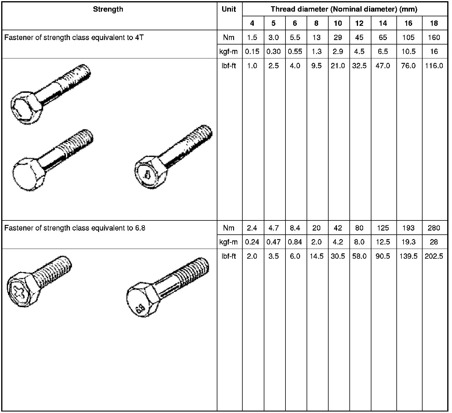 - For flanged bolts, flanged nuts and self-locking nuts of the 4T and 7T strength classes, add 10% to the applicable tightening torques given in the following chart.