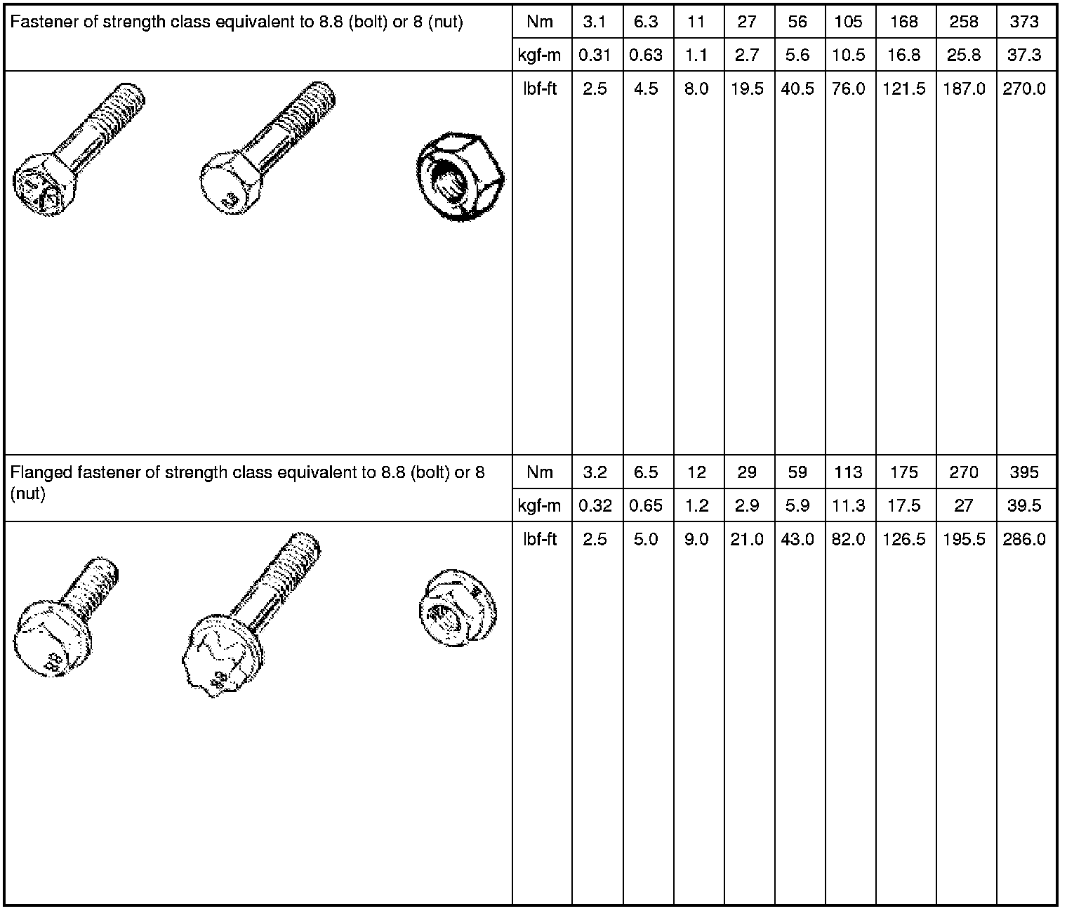 Each fastener should be tightened to the torque specified in each section. If no torque description or specification is provided in the relevant section, refer to the following tightening torque chart for the applicable torque for each fastener. When a fastener of greater strength than the original one is used, use the torque specified for the original fastener.