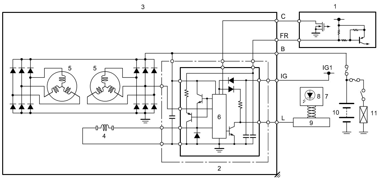 The generator is of a built-in IC regulator type. Internal components are connected electrically as shown in figure.
