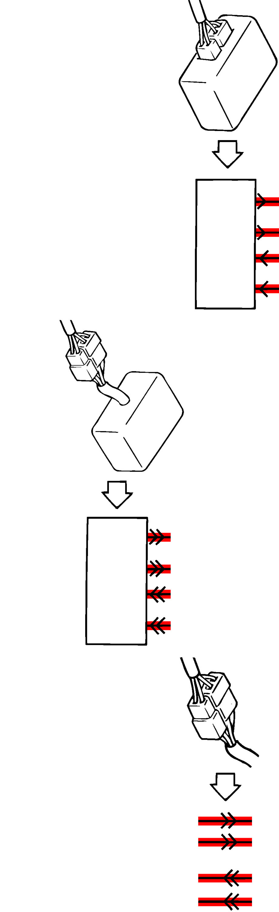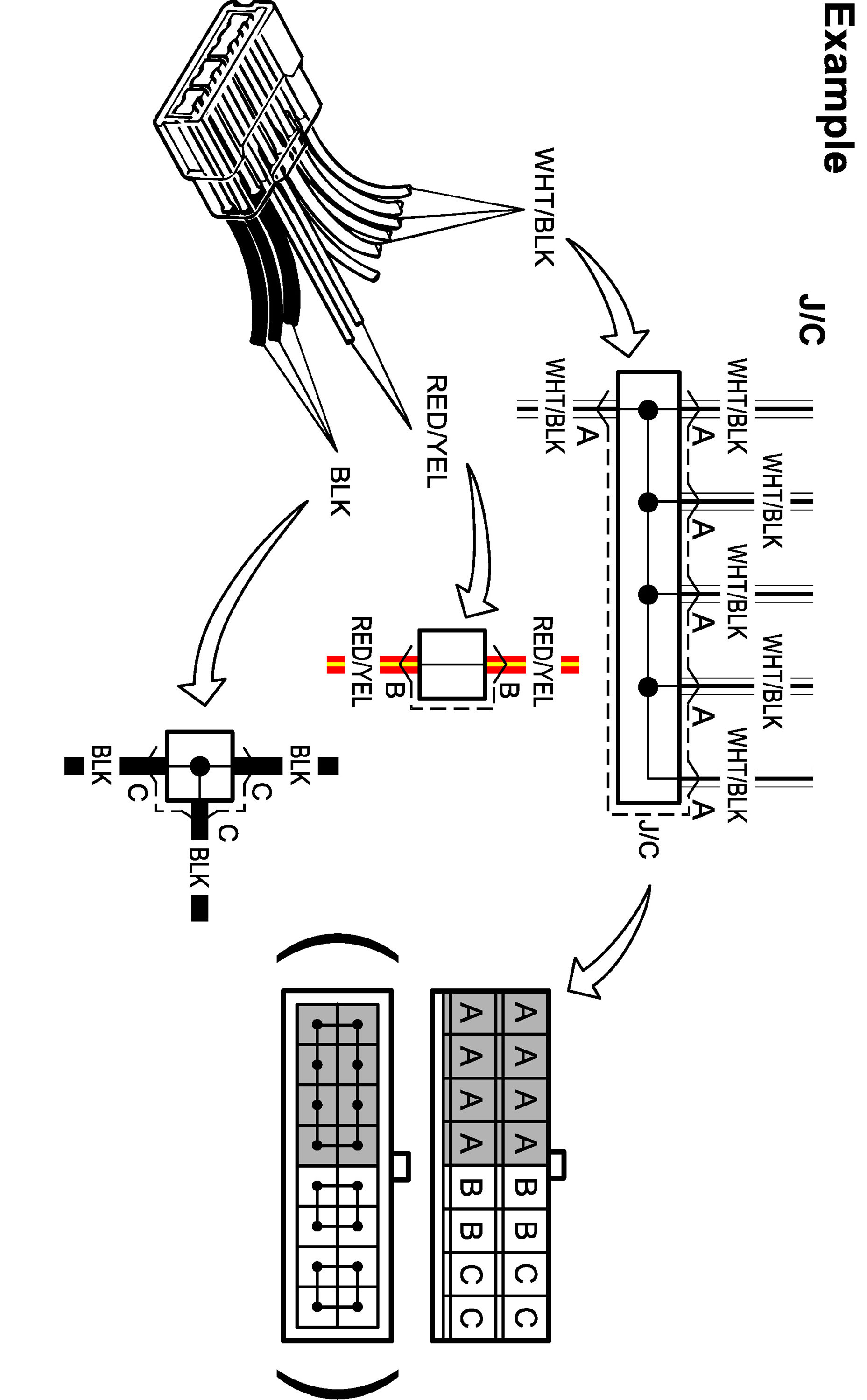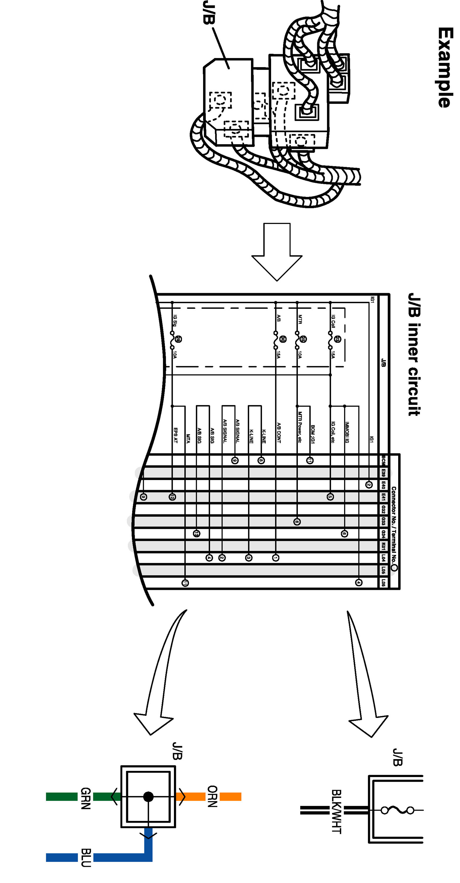 ^ The joint connector (J/C) connects several different wires with the same wire color at one place instead of connecting them by welding or caulking one by one. It is not an ordinary connector but a part of the continuous wire in the harness.