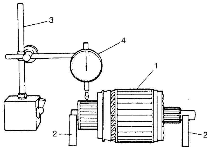 - Check commutator for uneven wear with armature (1) supported on V-blocks (2) by using dial gauge (4). If dial gauge (4) deflection exceeds the limit, repair commutator or replace armature.