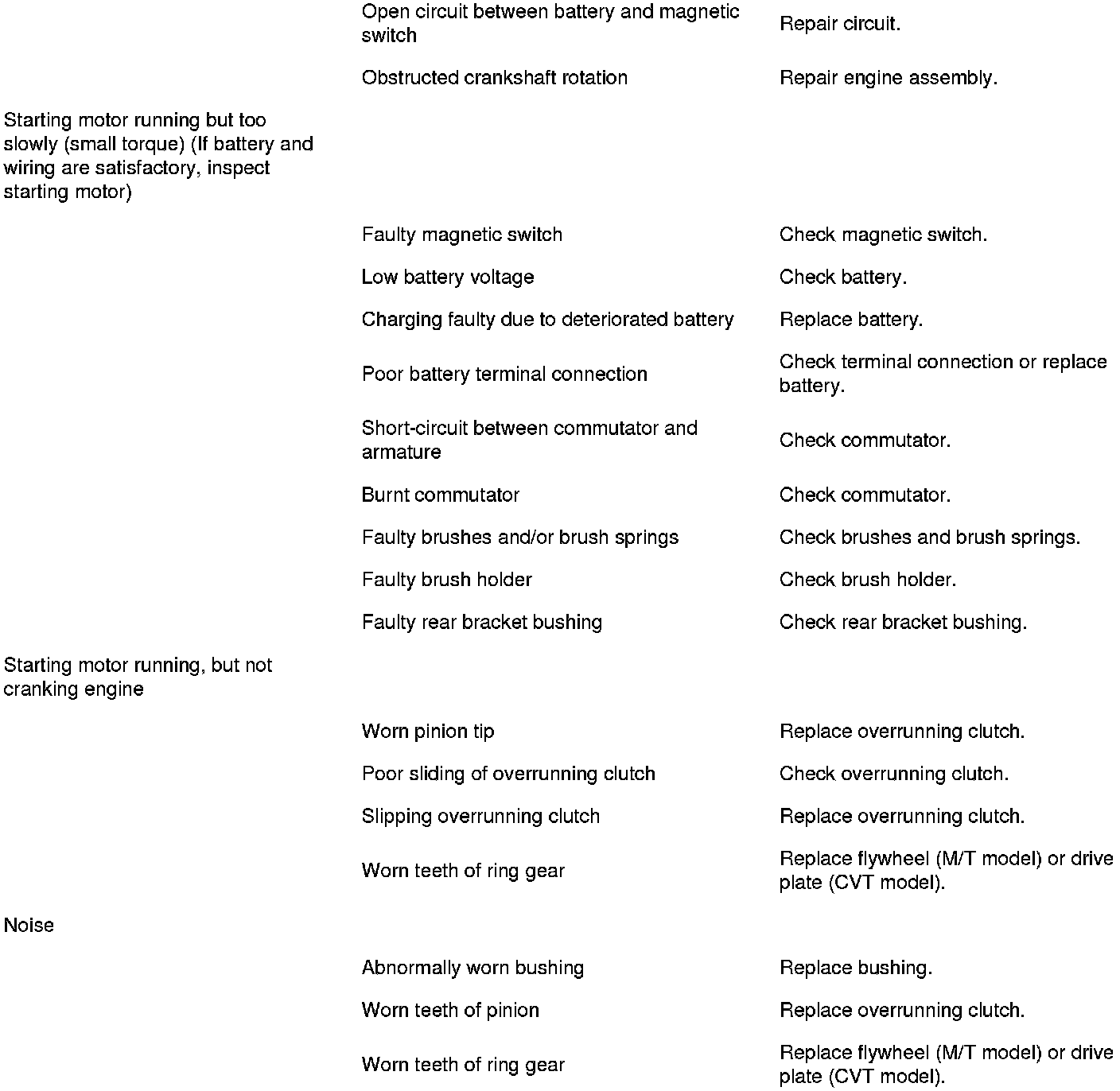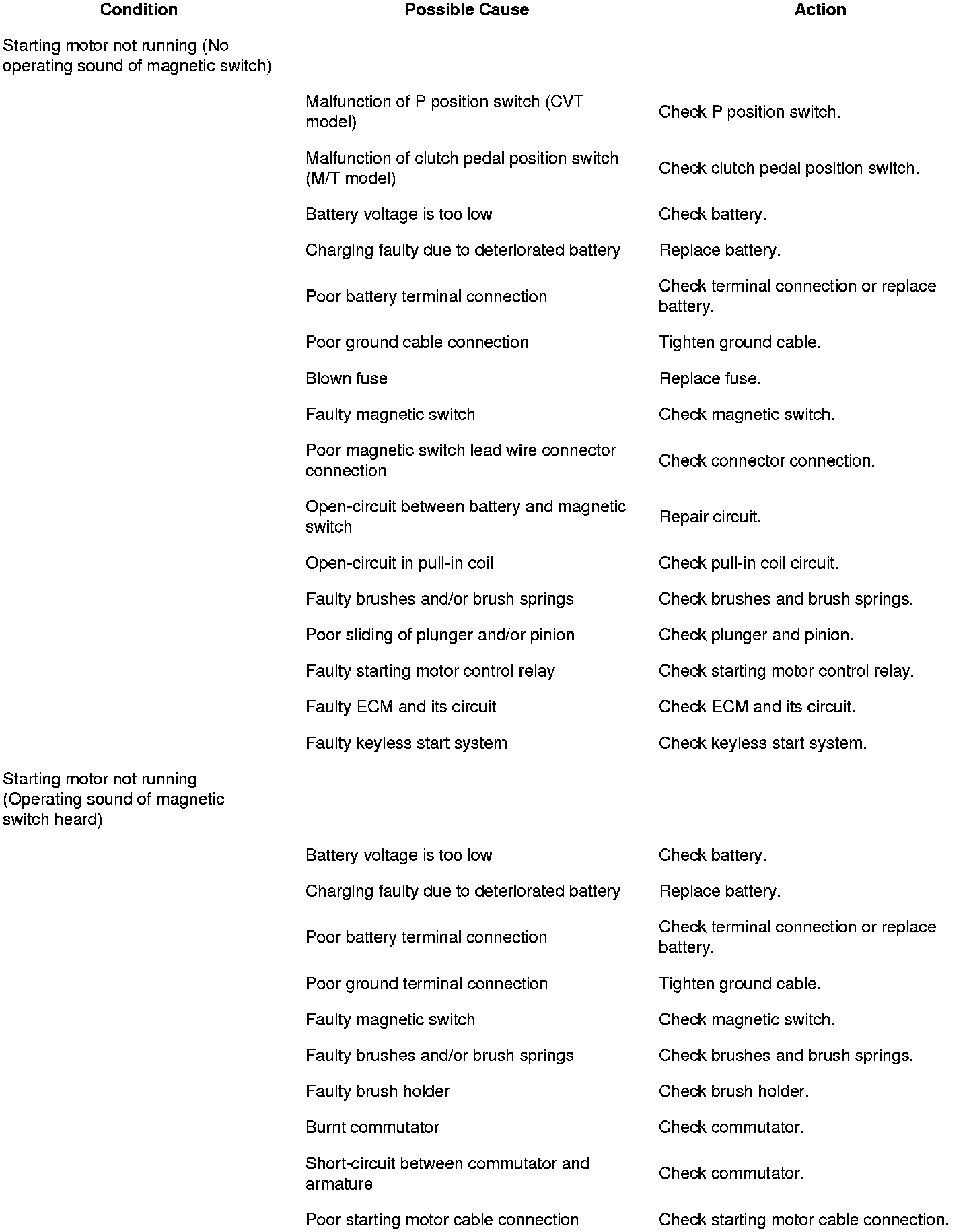 Before removing the starting motor to perform inspection, check the following items to narrow down the possible causes of trouble.
