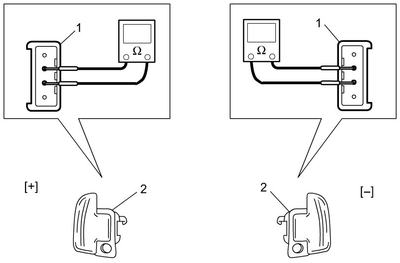 Check for continuity between terminals of shift paddle switch connectors (1). Replace steering wheel assembly if check result is not as specified.