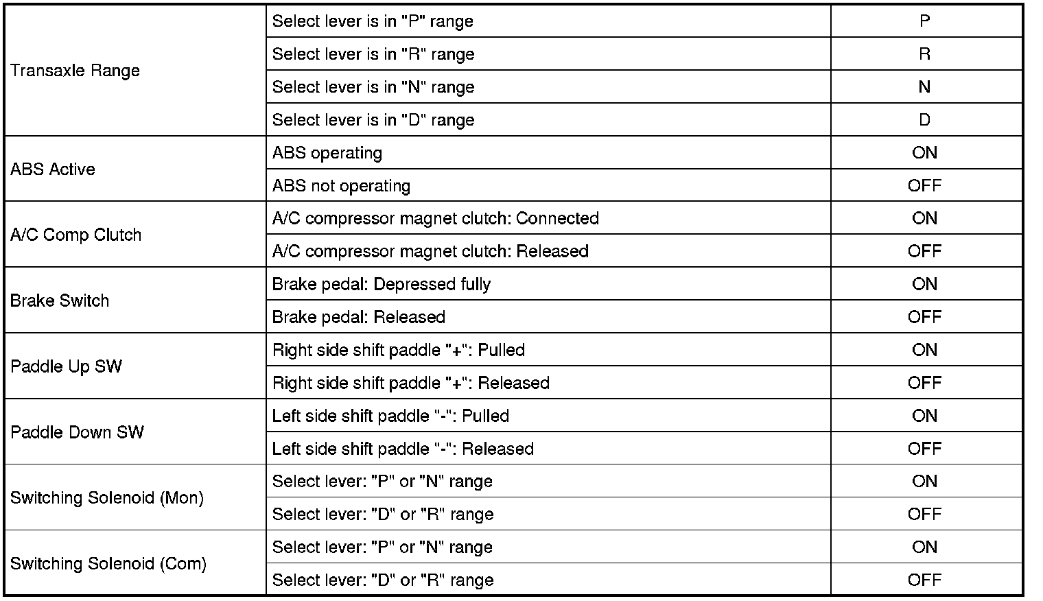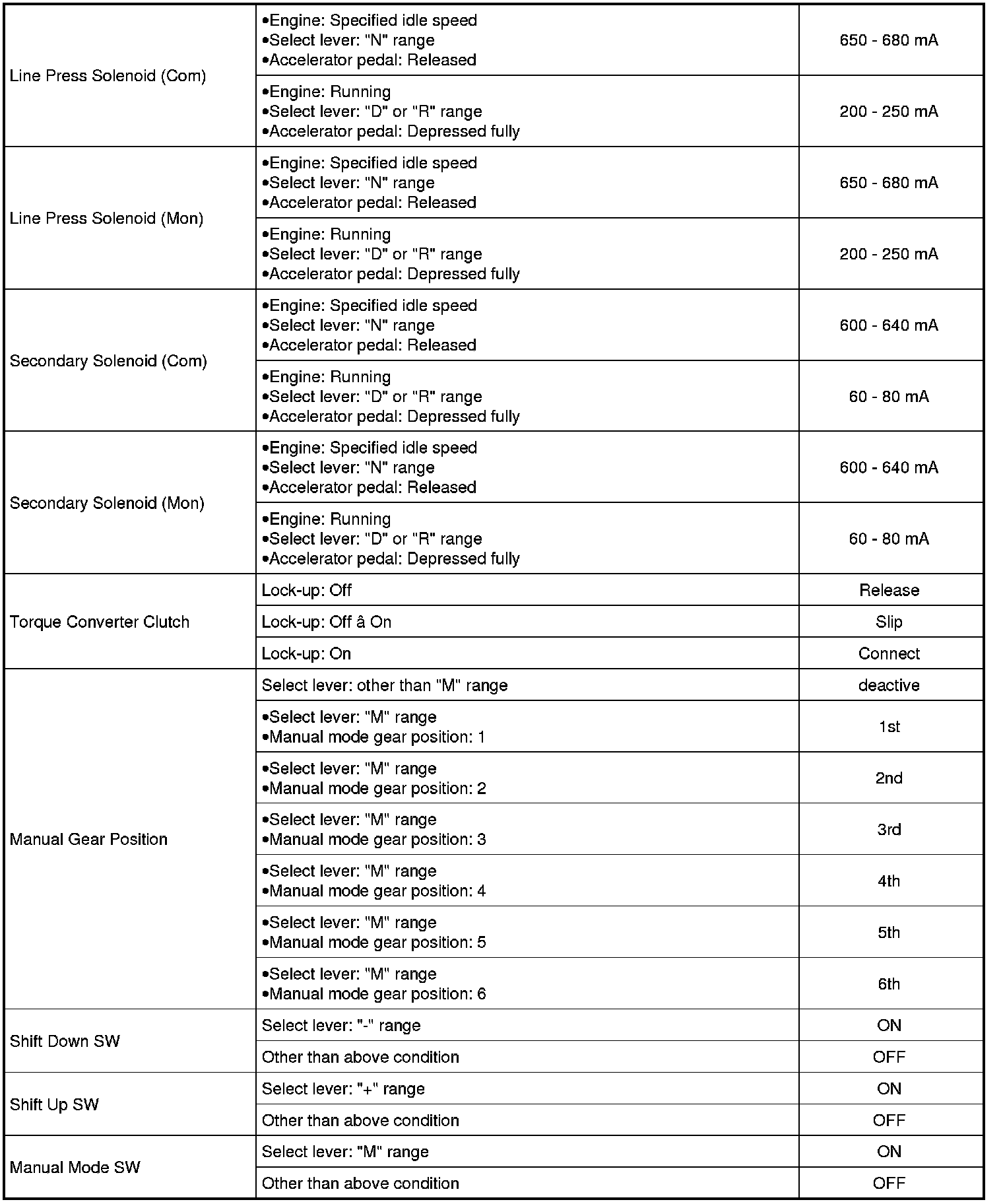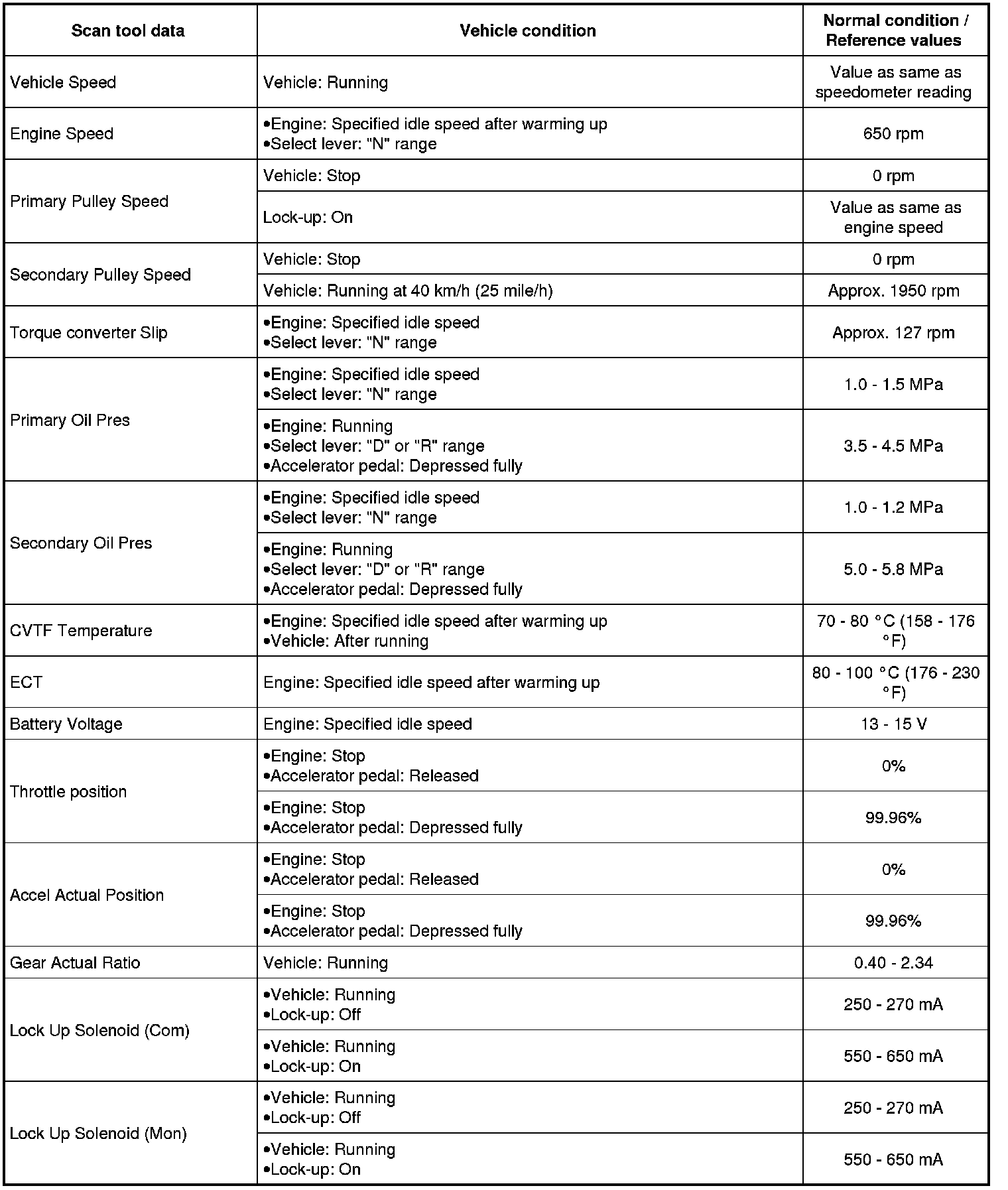 Also, condition in the following table that can be checked by the scan tool are those detected by TCM and output from TCM as commands and there may be cases where the CVT or actuator is not operating (in the condition) as indicated by the scan tool.