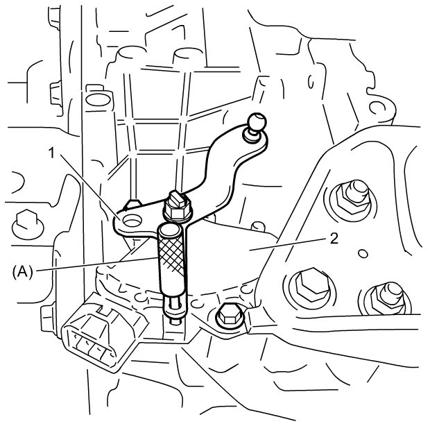 3) Shift select lever to "N" range and use special tool to check that aligning holes on manual select lever (1) and transmission range sensor (2) are aligned as shown in figure. If not, adjust transmission range sensor. Adjustments