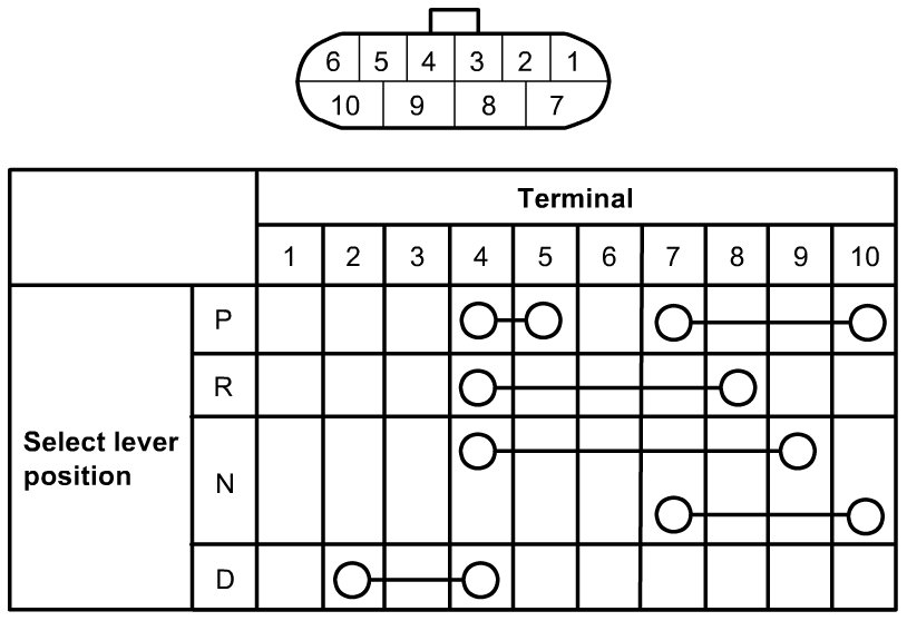 4) Check for continuity between terminals of transmission range sensor connector over each range shown in figure.